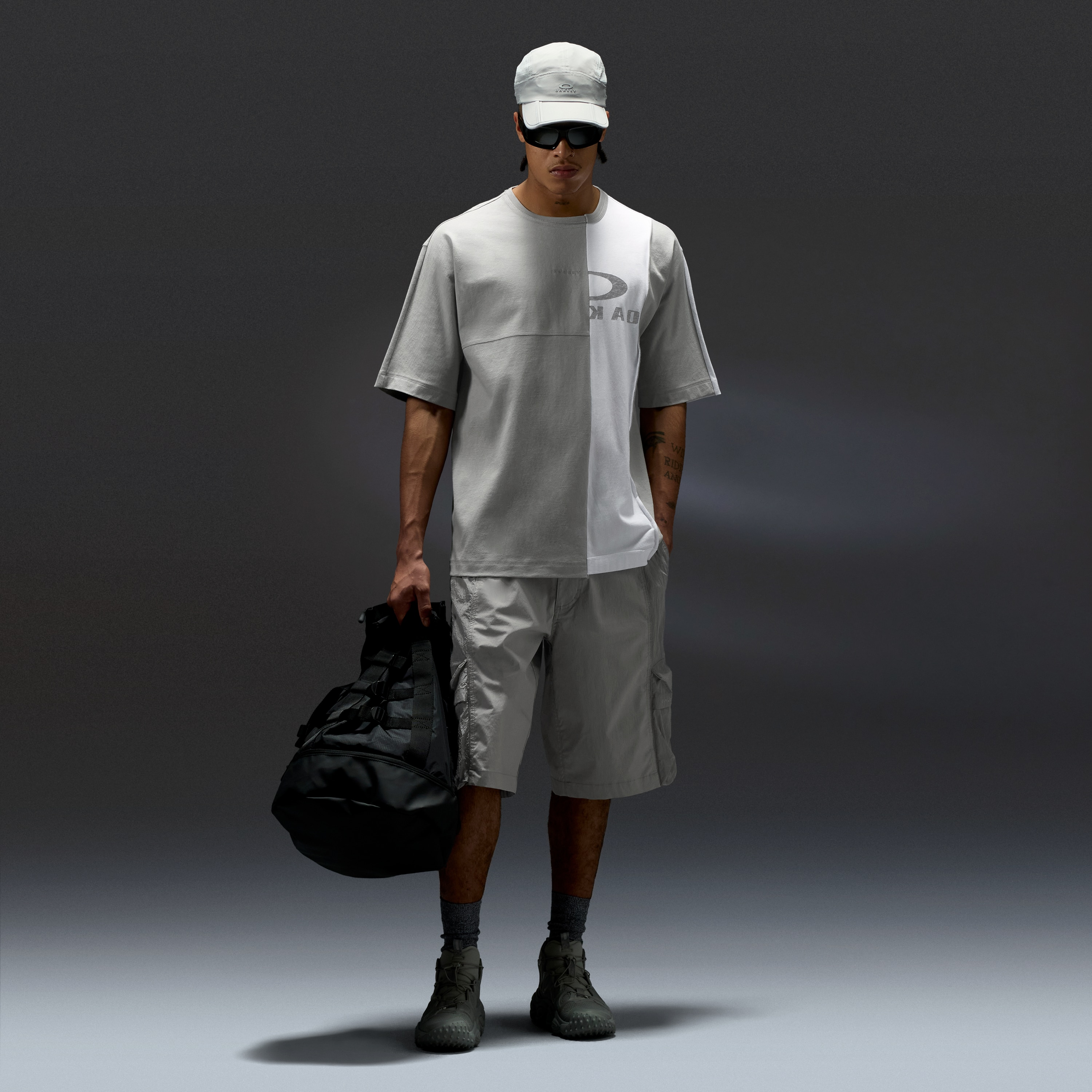 - Deconstructed oakley bark logo on front with mixed printing techniques: digital print & 3d raised print