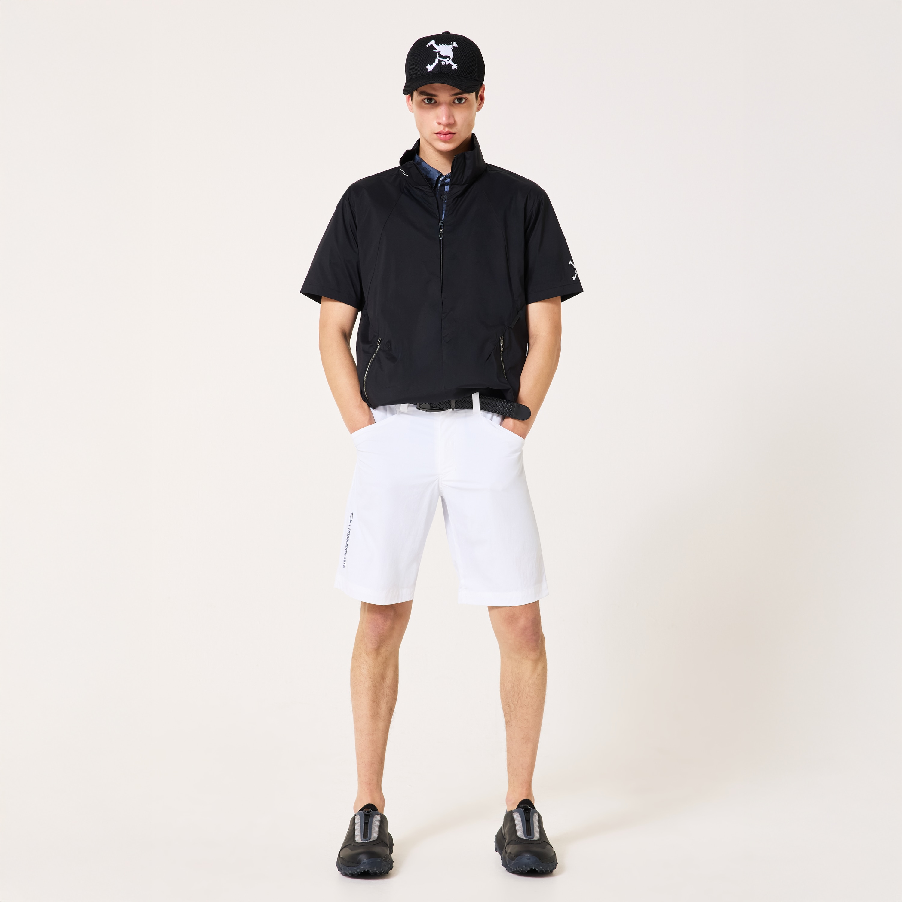 Original short-sleeve wind jacket tailor-made for that unpredictable spring weather out on the course. Made from a lightweight stretch nylon material finished with a windproof coating that also forms an effective barrier against the rain, it is constructed with a roomy silhouette to guarantee maximum freedom of movement and a back panel that provides additional ventilation. Simple yet versatile design elevated with a Skull logo print on the right shoulder and side pockets with metal zippers.