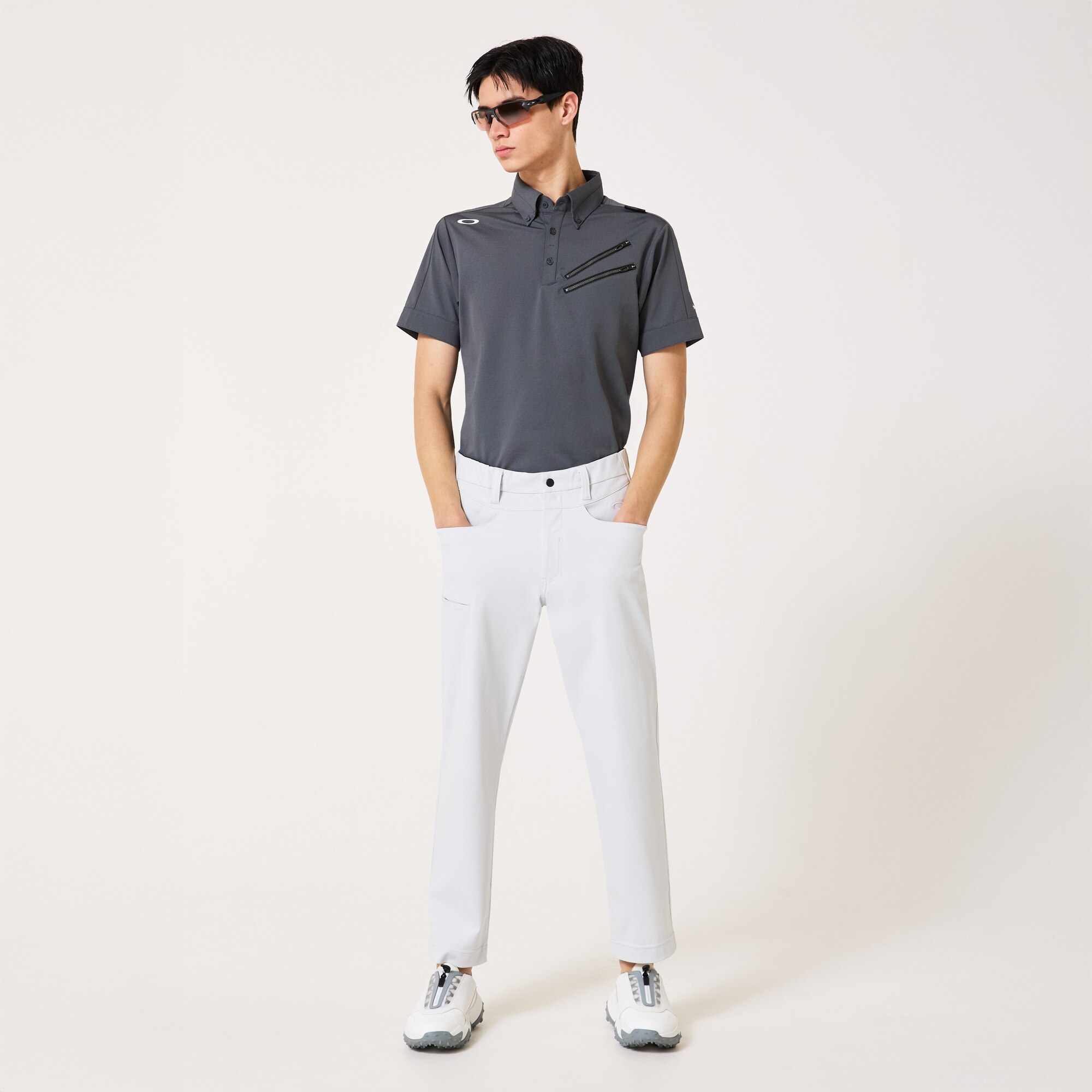 This button-down shirt is made from a high-performance fabric which combines a 4-way stretch construction, perfect for guaranteeing freedom of movement on the course, with a cool contact function on the front and the back of the collar which reacts to moisture to cool down the shirt and keep you comfortable even in hotter conditions. As well as its perspiration-wicking and quick drying properties, the dry touch nylon chambray material also has in-built UPF protection to keep you safe in the sun, and the shirt is further elevated with a distinctive metal-style double zipper and graphic detailing.