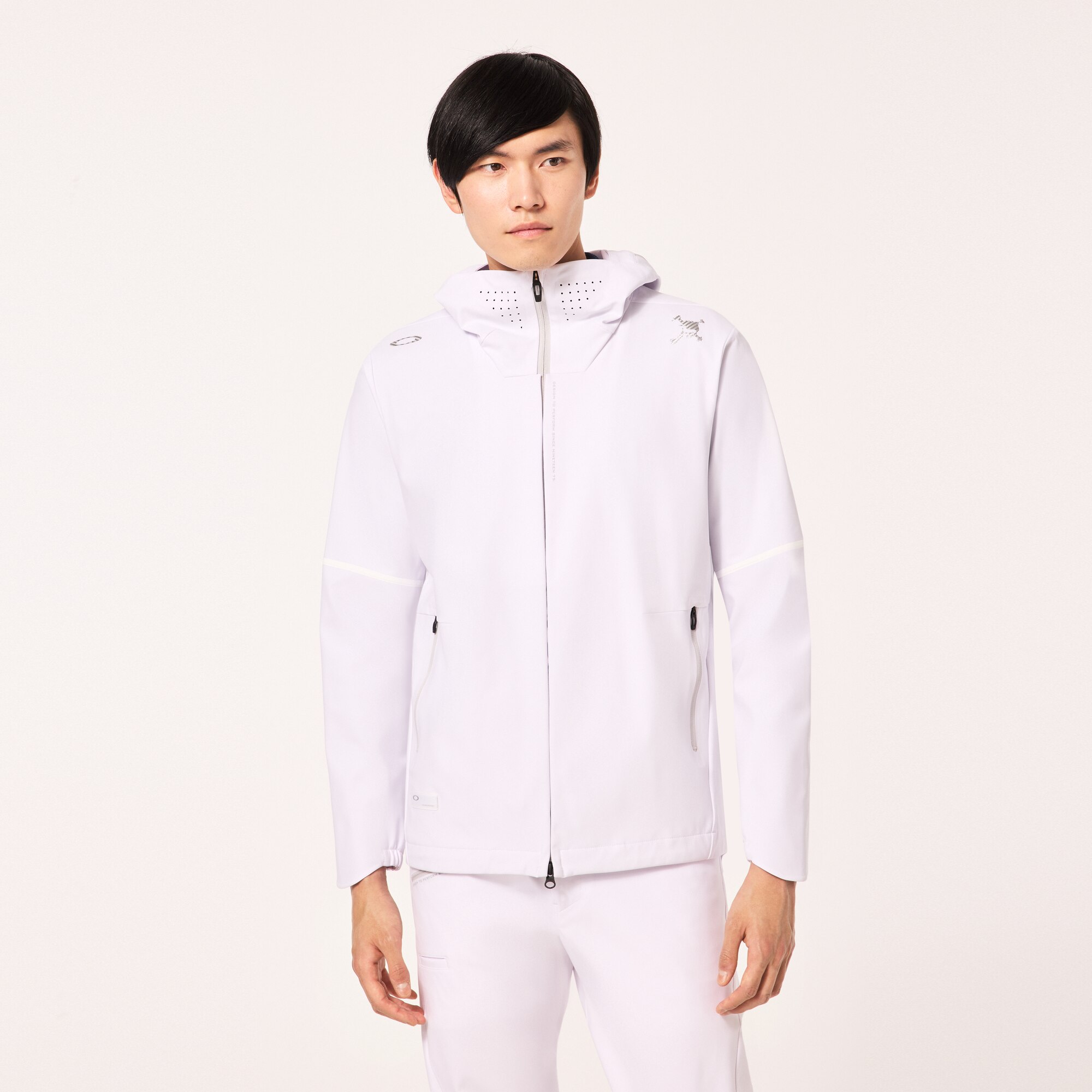 ゴルフに特化した身体とのシンクロを追求したWHITE LABELのフーディージャケット。究極の快適性を求めた独自のパターンを開発し、脇の縫い目と袖下のマチ、背中のアームホールの縫い目を軽減。袖は腕の上げやすい立体裁断によって細めシルエットでも動きやすく高いパフォーマンスを発揮。軽量でソフトな4WAYストレッチ素材はプレー時の不快を軽減し、適度な肉感で通年活躍するアイテム。GOLF用に考えたフードはファスナーを閉じる事で面積を減らし、プレー中のバタつきを抑え、スタイリッシュに着用可能。ウエスト部分にもスピンドルを搭載し、フロントファスナーの突き出しを抑える設計。WHITEのカーボン調のロゴとプリント、WHITEの付属が大人のスポーツテイストを演出。