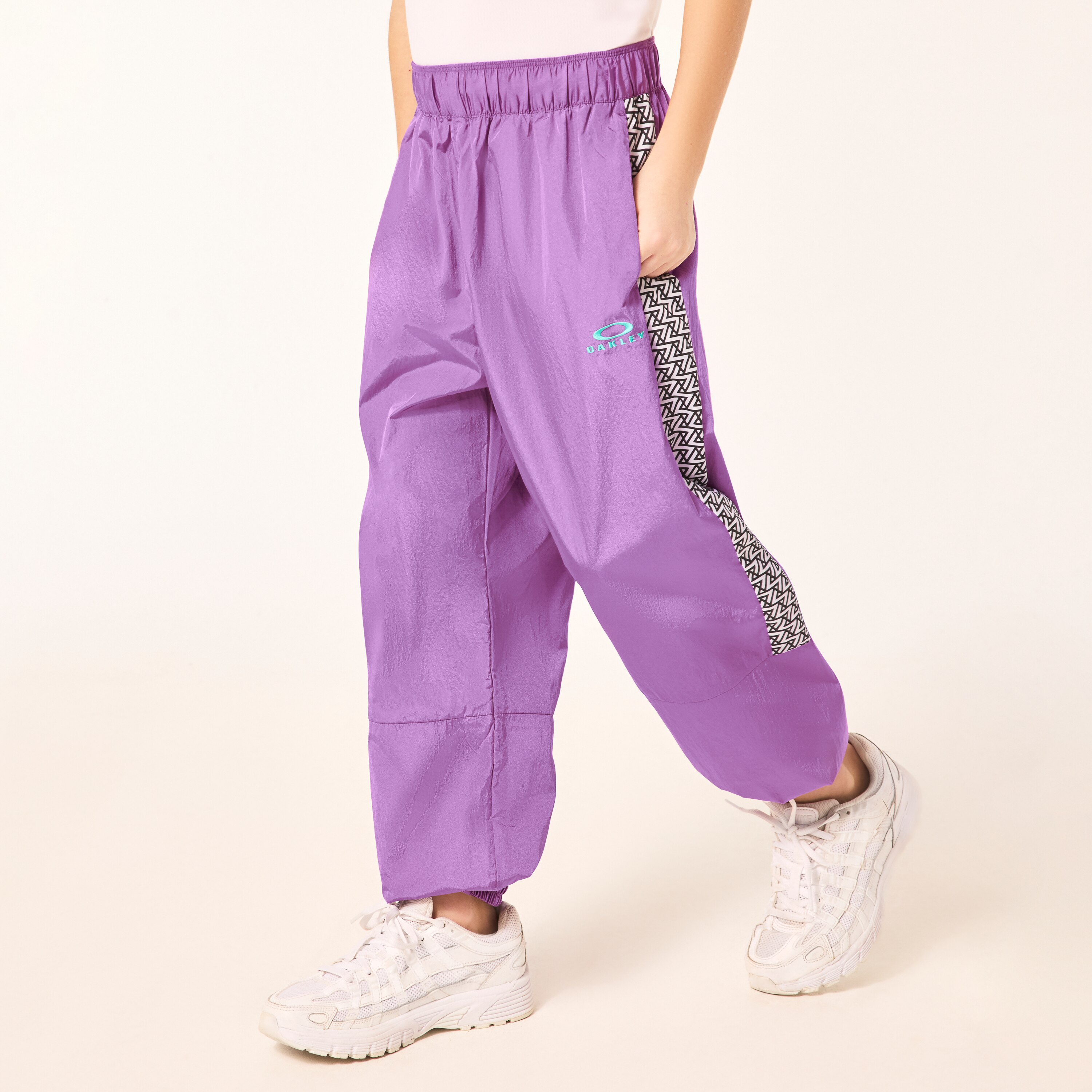 軽やかに穿けて紫外線から肌を守ってくれるウインドパンツ。サイドの幾何学柄切替がデザインポイント。シーンを選ばず動き回る事ができるルーズシルエットを採用し、右膝裏のリフレクトピスネームが夜間の視認性を向上。