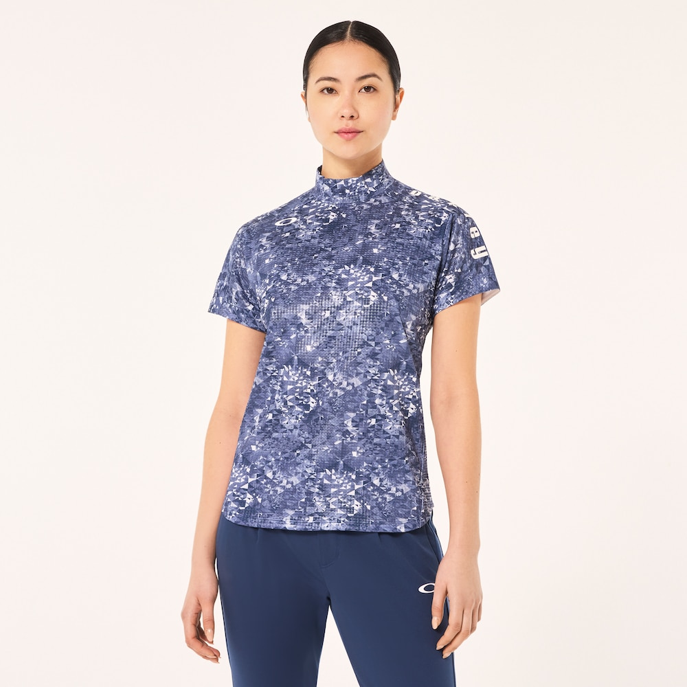 通気性の高い吸汗速乾のメッシュ素材を採用したグラフィックモックシャツ。グラフィックをプリントした後にエンボス加工を施し、生地全体に凹凸感を出す事で、肌面のベタ付きを減らしながら新しい見え方を表現。総柄に入ったプリントは花柄を万華鏡の様な幾何学に切り取って表現した特徴的なグラフィック。馴染ませた着合わせやすいカラーとインパクトあるマルチカラーの展開。『O-TECH COLD』の接触冷感の機能を取り入れ、盛夏まで快適に着用可能。袖は脇下のシームをずらし袖の上げやすいパターン設計で快適なプレーをサポート。裾はラウンドする事でタックインした際には出にくい仕様、外に出した際は裾のラインが綺麗に見えるようアレンジ。