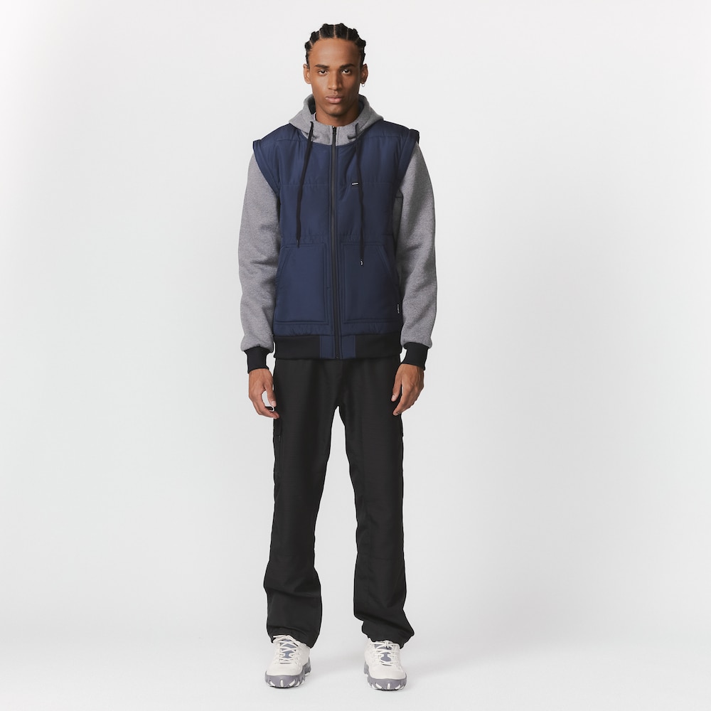 O modelo OAKLEY HYBRID JACKET apresenta um design híbrido com mangas em moletom e o corpo acolchoado estilo colete, proporcionando isolamento térmico e conforto. O capuz com recorte limpo e cordão com ponteira emborrachada garante proteção contra o frio, enquanto o bolso canguru adiciona praticidade. Detalhes como o patch termocolante Oakley no peito e o fechamento por zíper com puxador personalizado reforçam a autenticidade e a qualidade da peça. A ribana nos punhos e na barra completa o visual com ajuste seguro e confortável.